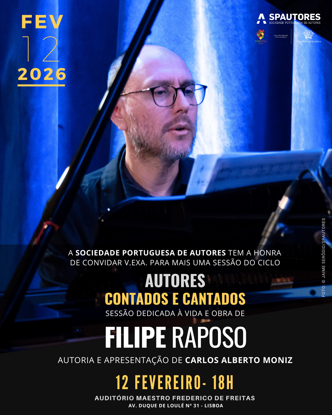 A Sociedade Portuguesa de Autores convida todos os interessados a assistir a mais uma sessão do ciclo “Autores Contados e Cantados”, dedicada a Filipe Raposo, pianista, compositor e figura incontornável da música e da cultura nacional.