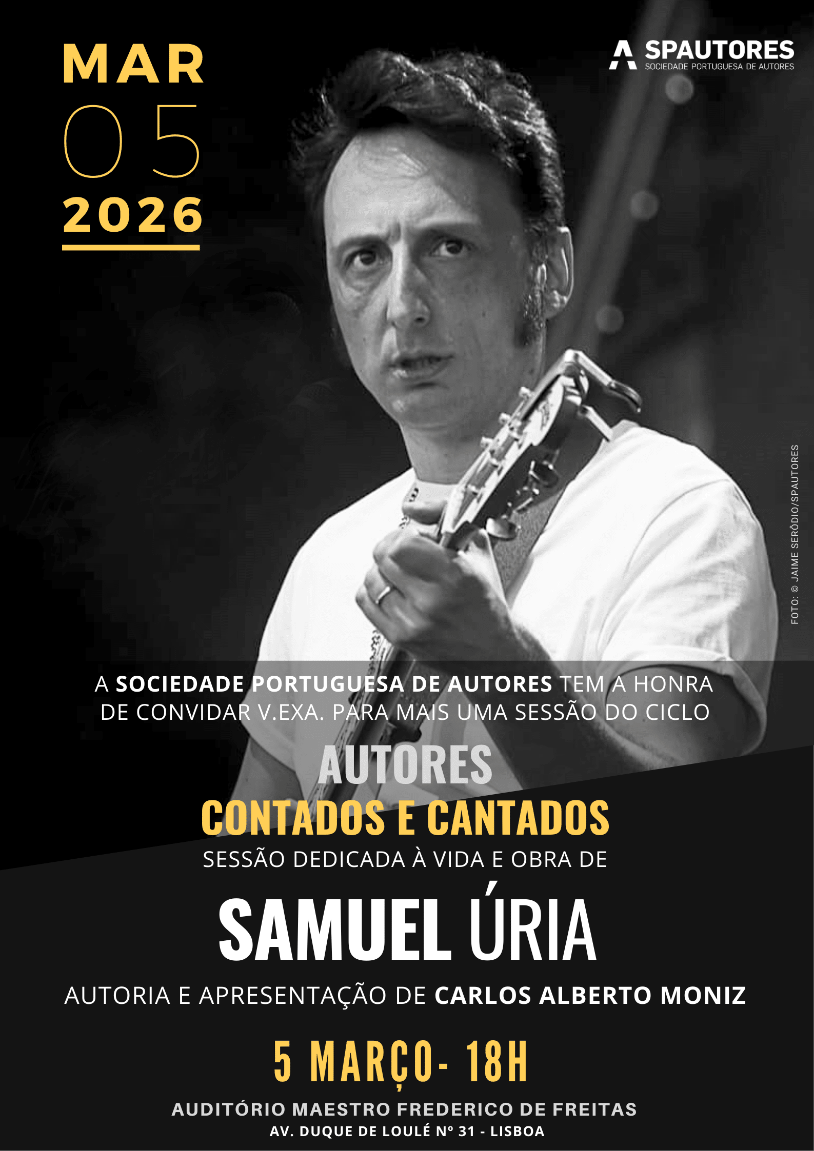 A Sociedade Portuguesa de Autores convida para mais uma sessão do ciclo Autores Contados e Cantados, dedicada à vida e à obra de Samuel Úria.